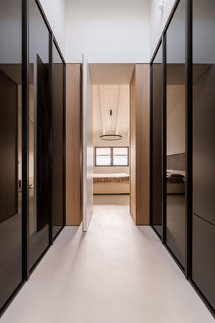 Essenziale, minimalista, armonico: l’intervento “Casa Erre” -in cui lo studio ZDA ha collaborato con Roberto Marchini di Prima Srl, che ne ha curato il progetto architettonico, distributivo interno e la direzione lavori e artistica- ha riguardato la parte relativa alle scelte di cromatiche delle finiture, selezione di materiali, passando progettazione di mobili su misura, caratterizzata da un arredo completamente plasmato attorno allo spazio, per valorizzarlo nel segno della semplicità (delle forme) e della continuità (nei materiali). Fra questi, spiccano il legno impiallacciato, finiture in noce canaletto contrastate da intarsi laccati neri, e, ancora, elementi in alluminio e vetro, sui medesimi toni del nero. Le porte, nascoste nelle armadiature, attraverso l’effetto scomparsa, rafforzano l’idea di totale pulizia e rigore geometrico che contraddistingue l’intervento, amplificandone al contempo gli accenti di razionalità e funzionalità, con l’intenzione di creare un’atmosfera elegante e pragmatica. L’arredo, infatti, diventa anche parte integrante dell’architettura, con pareti mobili che dividono gli spazi e ne definiscono i volumi; la scelta del cemento resina a pavimento, nei bagni, su alcune pareti e sull’isola della cucina, garantisce resistenza, oltre che linearità e gradevolezza estetica-visiva.
