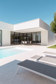 Il progetto di “Casa Ora” nasce dall’intersezione di due volumi lineari che, seguendo le direttrici dell’area, definiscono la particolare forma angolare dell’abitazione. I due volumi accolgono ciascuno la zona notte e la zona giorno open-space, delimitando l’area esterna del giardino e creando una vista continua sulla zona piscina. Grazie alla presenza di grandi vetrate poste su questo lato, il limite visivo tra interno ed esterno viene meno, inondando di luce naturale i vari ambienti dell’abitazione. Agli antipodi è il fronte nord, posto verso la strada, che è stato caratterizzato dalla presenza di aperture svasate a tutta altezza, utili a favorire l’ingresso della luce solare, oltre che a preservare la privacy delle stanze affacciate su questo lato. La svasatura è ripresa anche nella zona d’ingresso dell’abitazione, per creare un accesso coperto e, nel lato ovest, per tracciare la particolare inclinazione a livello planimetrico. La prevalenza del bianco dell’intonaco e della pietra naturale della pavimentazione all’esterno, ma anche delle pareti e dei serramenti interni, crea un favoloso contrasto con i telai degli infissi in antracite e dei tocchi in legno naturale scelti per gli interni e per alcuni elementi di arredo.